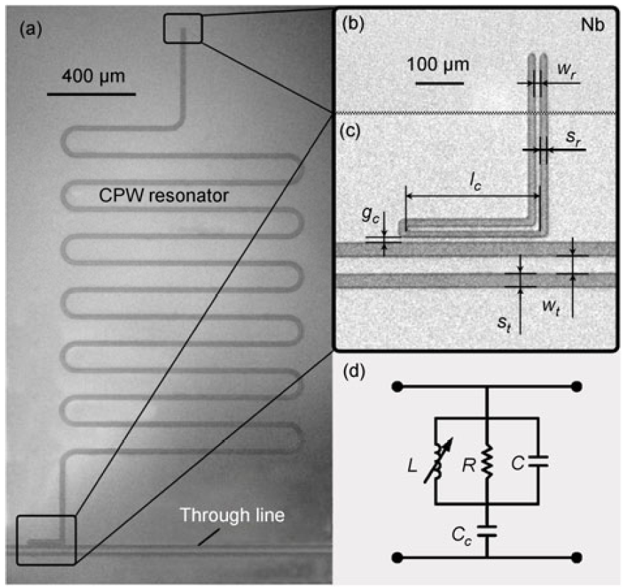 are made from a niobium film (about 160 nm thick) on a high-resistance Si substrate, and each resonator is fabricated as a